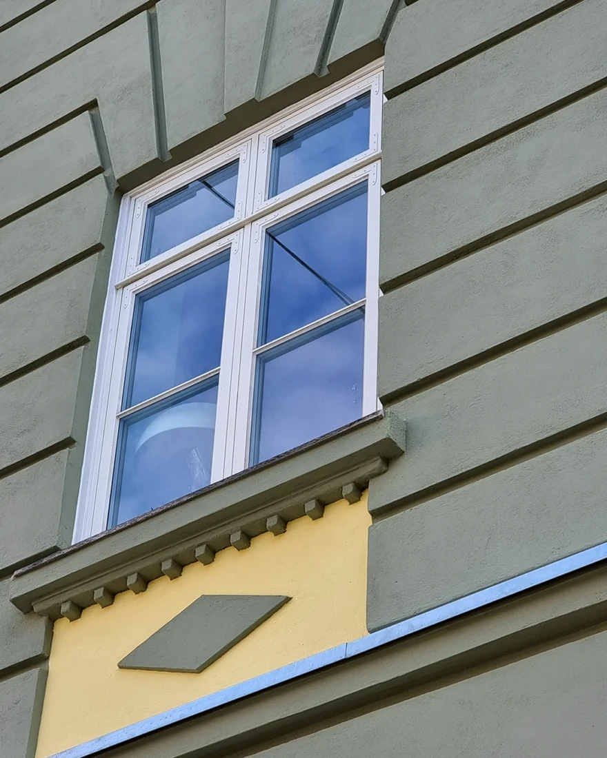 Vi har lagt stor vekt på å bruke tradisjonelle metoder, som spesialtilpassede sjablonger for gesimsbånd og kvaderfelt. Arbeidet er utført med tresjikts NHL Kalkmørtel og stenkpuss på sokkel.